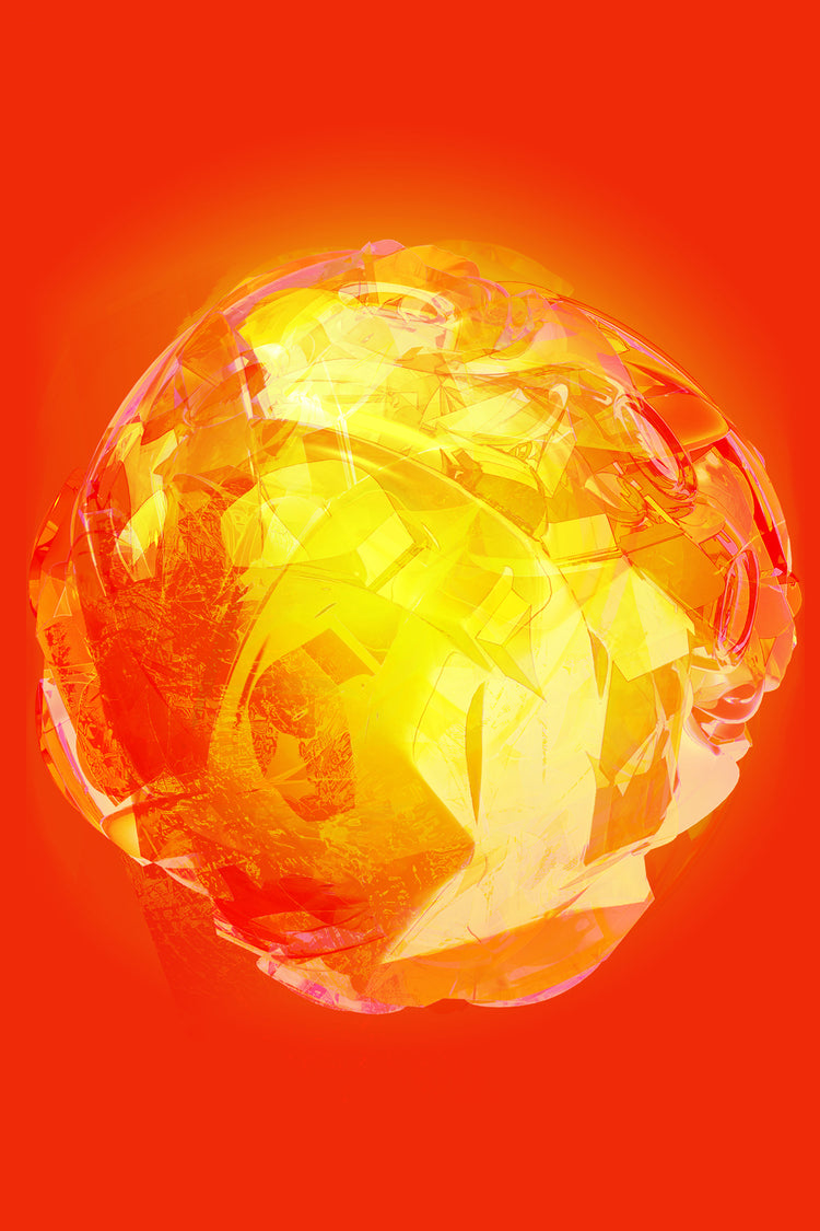 A digital abstracted fine art metal print of planet Earth. In fiery red with splashes of yellow.