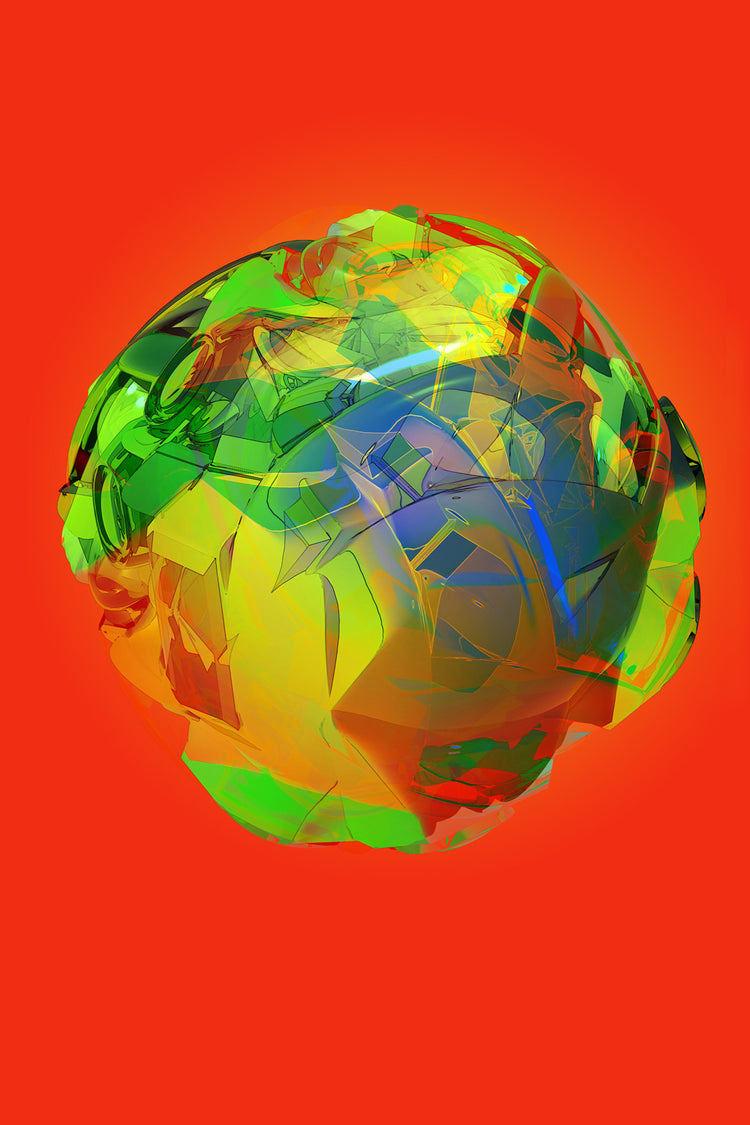 A digital abstracted fine art metal print of planet Earth. In fiery red with splashes of yellow, blue and green.