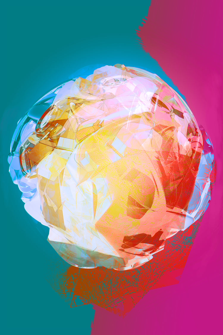 A digital abstracted fine art metal print of planet Earth. In soft fuchsia, turquoise and white with splashes of yellow.